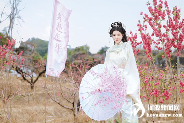 在連平縣上坪鎮(zhèn)桃花山,萬畝桃花競相綻放,粉紅嬌艷的桃花燦若云霞,從各地趕來的游客穿梭在桃林中,偶爾拿起手機或相機,記錄下眼前的美好,沉浸在爛漫的春光里。一旁,身著漢服的“桃花仙子”漫步桃花小徑,在桃樹下翩翩起舞,不時與游客合影互動,共賞桃園美景。
