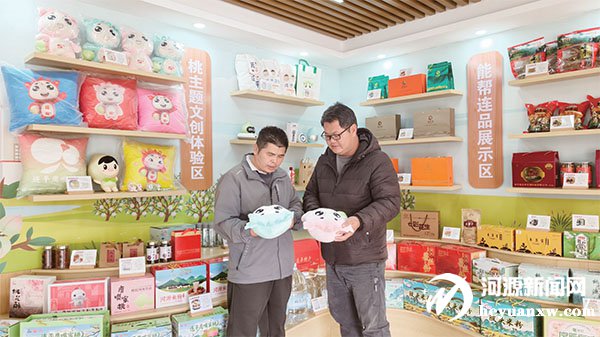 謝少劍(左)查看桃主題文創(chuàng)產(chǎn)品。