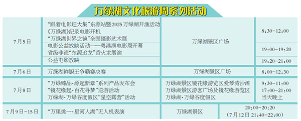 7月5日,“跟著電影趕大集”東源站暨2025萬綠湖開漁活動將在萬綠湖景區廣場盛大開幕。活動現場將舉行《萬綠湖》紀錄電影開機儀式和“萬綠湖世界之鏡”全國攝影藝術展啟動儀式。神秘嘉賓乘快艇驚艷亮相,與領導嘉賓共同敲響開漁銅鑼。活動尾聲,非遺體驗與特色美食長廊將帶您沉浸式感受萬綠湖的人文風情與舌尖魅力。當晚粵港澳電影周開幕,省級非遺“東源追龍”香火龍展演震撼上演,電影公益放映活動同步開啟。