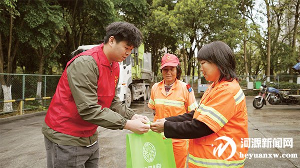 志愿者為環衛工人送上艾粄。
